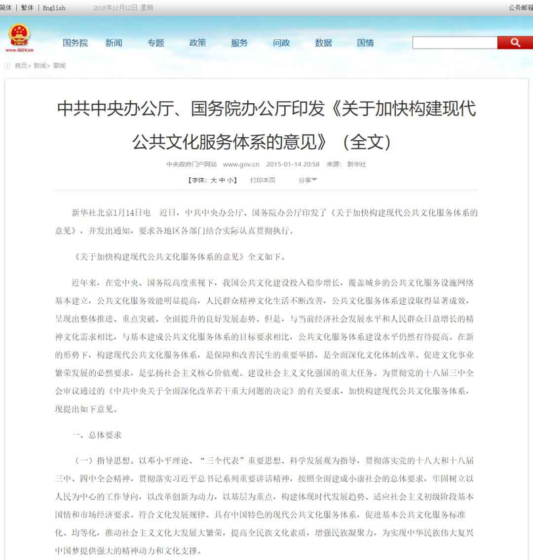 2015年(nián)初,中辦、國辦印發了《關于加快構建現代公共文化服務體系的(de)意見》