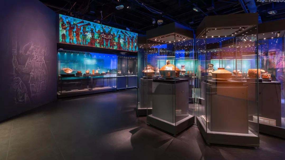 展廳以最具瑪雅文明特色的(de)元素裝飾:彩陶的(de)橙色和(hé)玉石的(de)綠色為(wèi)主色調,配合典型的(de)壁畫、陶器紋飾圖案;
