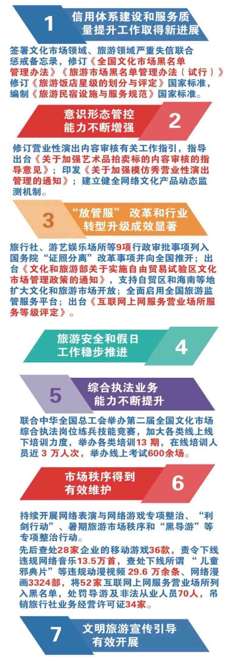 信用體系建設不斷加強,“黑名單+備忘錄”的(de)監管制度初步确立,失信專項治理(lǐ)成效顯著。互聯網上網服務、文化娛樂(yuè)行業轉型升級深入推進。網絡文化市場內(nèi)容自(zì)審得到推廣。網絡表演等文化市場專項整治、旅遊市場秩序專項整治“利劍行動”和(hé)對新業态的(de)引導、規範有力有效,行業自(zì)律意識明顯增強。“文明旅遊為(wèi)中國加分”百城聯動主題活動深入開展。旅遊安全監管力度加大,文化和(hé)旅遊部共發布安全提示提醒30餘次。境內(nèi)外旅遊安全事故得到及時有效處置。旅遊市場監管國際合作取得新進展。綜合執法隊伍規範化建設不斷加強,第二屆全國文化市場綜合執法崗位練兵(bīng)技能競賽成功舉辦。