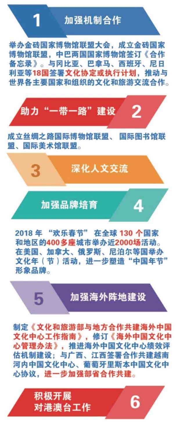 上合組織文化部長(cháng)會晤、旅遊部長(cháng)會議,中日韓文化部長(cháng)、旅遊部長(cháng)會議,第四次中國—中東歐國家旅遊合作高(gāo)級别會議(“16+1”)等活動成功舉辦。我國高(gāo)票(piào)當選《保護非物質文化遺産公約》委員國。“歡樂(yuè)春節”和(hé)“美麗中國”旅遊推廣等品牌活動影響力持續提升。海外中國文化中心、旅遊辦事處窗口作用有效發揮,中國文化周等活動獲得民衆好評。對港澳台交流活動更加活躍,首屆內(nèi)地(dì)與港澳文化産業論壇、兩岸青年(nián)文化研習活動等成功舉辦。