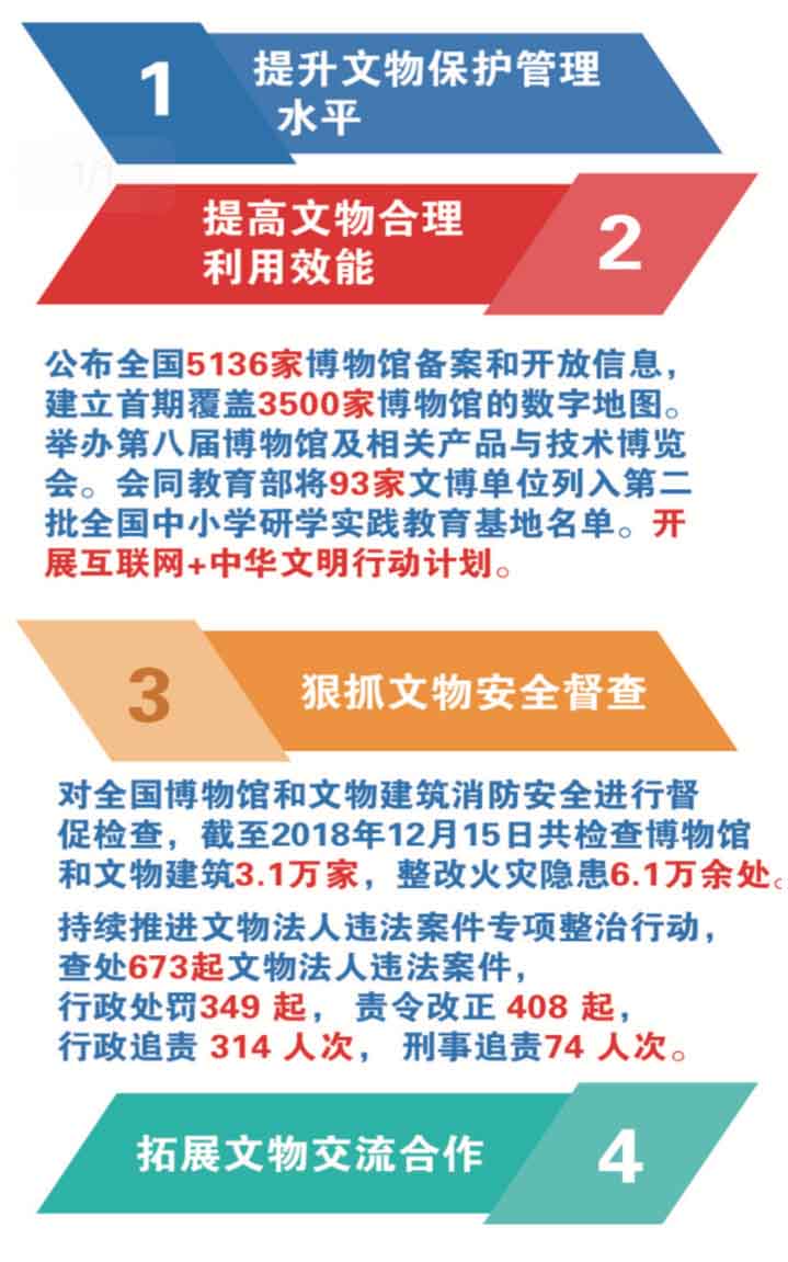 中辦、國辦連續出台加強文物保護利用改革、實施革命文物保護利用工程兩份政策性文件。文物安全進一(yī)步強化,重大案件偵破取得積極進展,全國打擊防範文物犯罪成果展廣受關注,博物館和(hé)文物建築消防安全得到加強。博物館行業管理(lǐ)與服務水平有效提升。中華文明探源工程成果宣傳推介取得實效,《國家寶藏》《如(rú)果國寶會說話》等節目得到好評。
