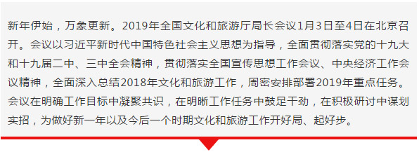 要把黨的(de)十九大精神學(xué)習貫徹作為(wèi)長(cháng)期任務、常抓不懈,堅決把各項決策部署落到實處。深入貫徹習近平總書記在慶祝改革開放40周年(nián)大會上的(de)重要講話精神,增強責任感和(hé)緊迫感,加快推進體制機制改革,激發發展活力。要以全國宣傳思想工作會議精神統領文化和(hé)旅遊工作,自(zì)覺承擔起“舉旗幟、聚民心、育新人、興文化、展形象”的(de)使命任務。積極對接中央經濟工作會議要求,主動擔當作為(wèi),堅定不移推進文化和(hé)旅遊領域供給側結構性改革,為(wèi)穩增長(cháng)、促改革、調結構、惠民生、防風險作出應有貢獻。緊緊圍繞慶祝中華人民共和(hé)國成立70周年(nián),開展創作、演出、展覽、宣傳等文化和(hé)旅遊活動,組織文化和(hé)旅遊市場專項整治,努力營造歡樂(yuè)祥和(hé)的(de)良好氛圍。落實中央關于打赢脫貧攻堅戰的(de)戰略部署,發揮文化和(hé)旅遊扶貧優勢,堅持定點扶貧與行業扶貧相結合,以“三區三州”深度貧困地(dì)區為(wèi)重點,進一(yī)步做(zuò)好文化和(hé)旅遊扶貧工作。(未完見下)