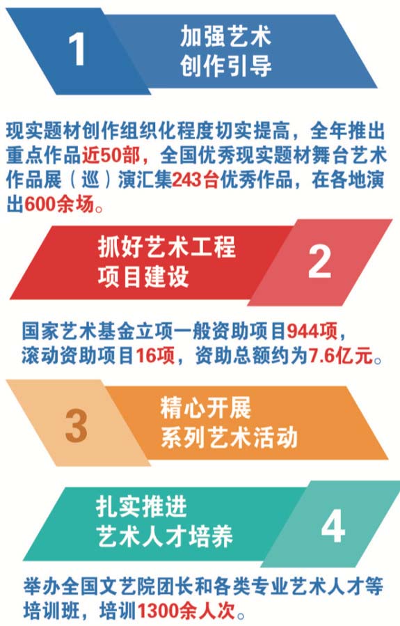 現實題材創作組織化程度切實提高(gāo),全年(nián)共推出重點作品近50部,全國優秀現實題材舞台藝術作品展(巡)演彙集243台優秀作品,在各地(dì)共演出600餘場。“主題歌曲+”創作推出一(yī)批優秀作品。戲曲百戲(昆山)盛典首次将全國戲曲劇種普查成果在舞台上彙集展示。國家主題性美術創作項目深入實施,全國美術館館藏精品展出季深受歡迎。藝術行業管理(lǐ)全面加強,對國有院團的(de)管理(lǐ)指導服務更加有力。深入生活、紮根人民成為(wèi)常态。