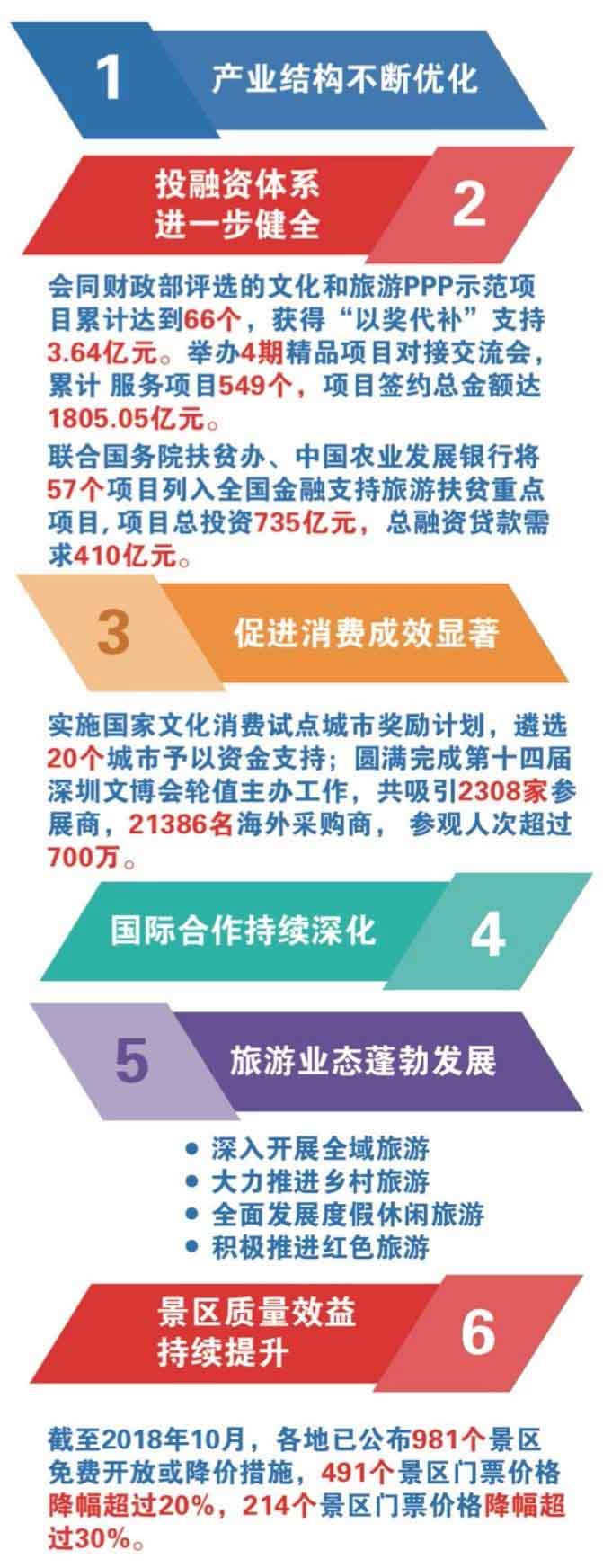 國辦《關于促進全域旅遊發展的(de)指導意見》逐步落實。旅遊消費持續增長(cháng),擴大文化消費試點工作形成了一(yī)系列有效模式。産業園區建設、管理(lǐ)更加規範。文化産業雙創扶持計劃啓動實施,民營文化企業、中小文化企業得到更多扶持。兩項數字藝術标準成功在國際電信聯盟立項。數字文化産業快速發展,中國文化藝術政府獎第三屆動漫獎評選有力引領了創作導向。各地(dì)積極挖掘文化和(hé)旅遊資源,發展特色産業。全域旅遊向縱深發展,全域旅遊示範區創建全面展開,形成了一(yī)批經驗做(zuò)法。旅遊景區動态管理(lǐ)不斷加強,新推出9家國家5A級旅遊景區,一(yī)批景區受到取消等級和(hé)警告處理(lǐ)。紅(hóng)色旅遊宣傳推廣有聲有色,五好講解員建設試點啓動實施。鄉村旅遊提質升級初見成效。新推出9家國家級旅遊度假區。2018年(nián)前三季度,全國規模以上文化及相關産業6萬家企業實現營收6.36萬億元,同比增長(cháng)9.3%;文化産品和(hé)服務進出口總額1016億美元,同比增長(cháng)10.1%。2018年(nián),國內(nèi)旅遊人數預計達55.4億人次,收入約5.13萬億元,同比分别增長(cháng)10.76%和(hé)12.3%;入境旅遊人數預計達1.4億人次,收入約1270億美元,同比分别增長(cháng)0.5%和(hé)3%;中國公民出境旅遊人數預計達1.48億人次,同比增長(cháng)13.5%;預計實現旅遊總收入5.99萬億元,同比增長(cháng)10.9%。