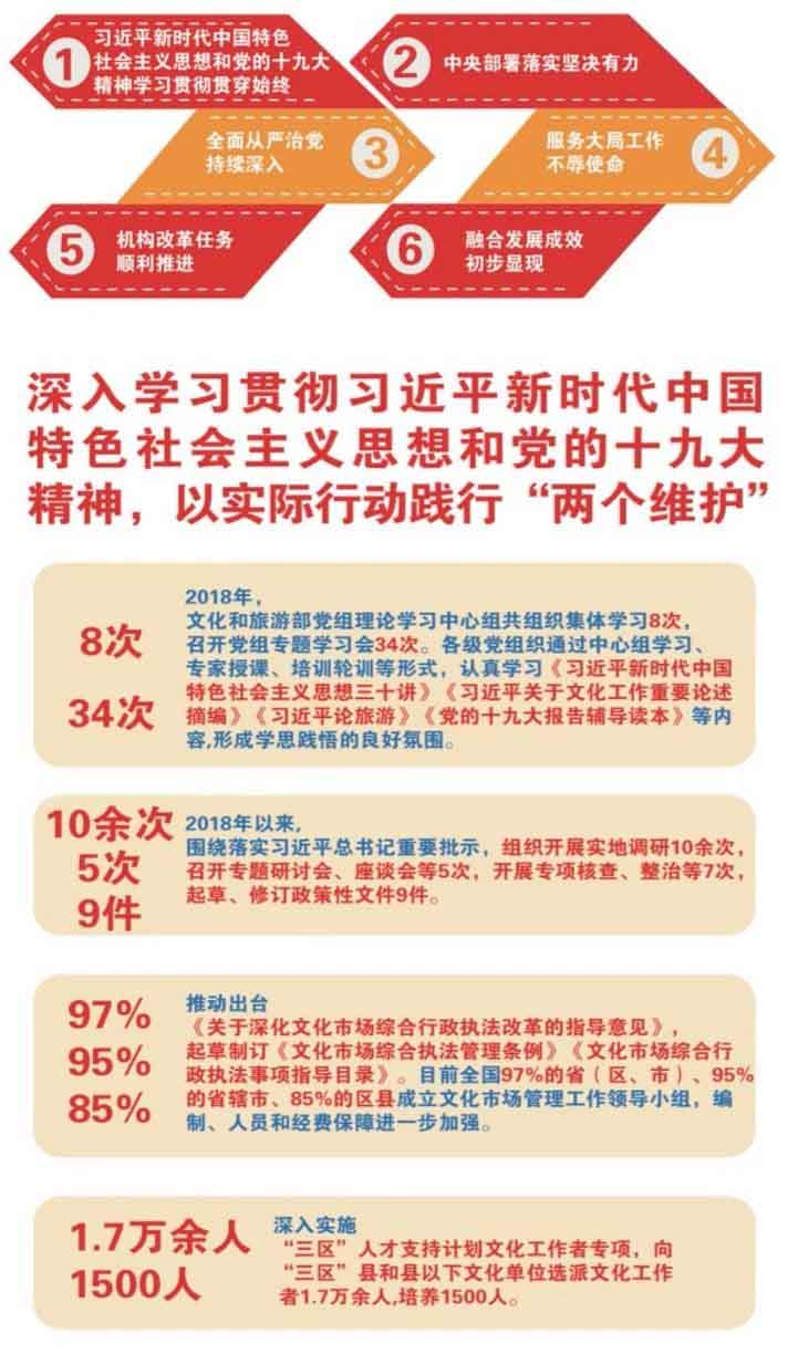 一(yī)年(nián)來,在黨中央、國務院堅強領導下,文化和(hé)旅遊系統堅持以習近平新時代中國特色社會主義思想為(wèi)指導,樹牢“四個意識”,堅定“四個自(zì)信”,堅決做(zuò)到“兩個維護”,全面貫徹落實黨的(de)十九大和(hé)十九屆二中、三中全會精神,貫徹落實黨和(hé)國家機構改革決策部署,勇于改革創新、奮力開拓進取,紮實推動文化和(hé)旅遊改革發展取得積極成效。全年(nián)工作呈現出六個特點:
