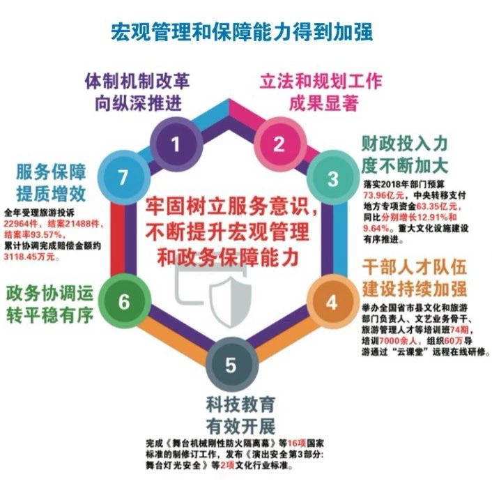體制改革不斷深化。國有演藝企業社會效益評價考核試點順利完成。邊境旅遊試驗區文化和(hé)旅遊融合發展計劃出台,促進旅遊演藝高(gāo)質量發展的(de)政策文件即将印發。“十三五”規劃中期評估深入開展,規劃對全局工作的(de)引領帶動作用有效發揮。法制建設深入推進。公共文化服務保障法、公共圖書館法加快實施,文化産業促進法起草(cǎo)取得重大進展,文化市場綜合執法管理(lǐ)條例、旅行社條例等立法項目取得積極進展。财政投入繼續增加。落實2018年(nián)部門預算73.96億元、中央轉移支付地(dì)方專項資金63.35億元,同比分别增長(cháng)12.91%和(hé)9.64%。重大文化設施建設有序推進。人才隊伍建設力度不斷加大。國家萬名旅遊英才計劃等人才項目深入實施,職業教育成果顯著,藝術創作、公共服務、産業發展、市場監管等領域培訓廣泛開展,培養了一(yī)批優秀人才。标準化工作全面加強,一(yī)批國家标準、行業标準發布實施。文化和(hé)旅遊部重點實驗室、文化和(hé)科技融合示範基地(dì)建設穩步推進。調查研究深入開展,智庫建設得到加強。清史纂修取得新進展,已形成送審稿。