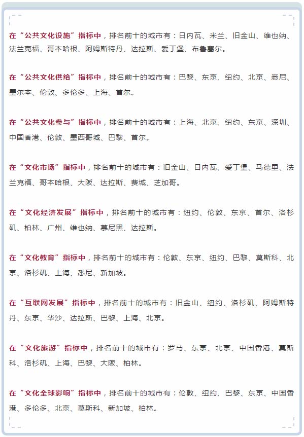 上海在國際文化大都市的(de)公共文化參與方面排名首位;在文化旅遊方面,排名第七;在文化教育方面,上海排名第八,整體實力均衡;在公共文化供給方面,上海位居第九,體現出較強潛力;在互聯網發展方面,上海排名第九,凸顯移動網絡優勢。