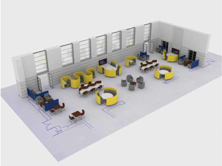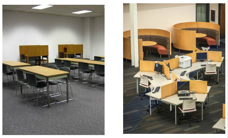 下圖中兩個空間都有小組讨論區和(hé)個人學(xué)習區,都為(wèi)相應的(de)工作模式配備适合的(de)家具。不同的(de)是,右側的(de)空間考慮了上述幾個因素、并将具備吸引力的(de)審美要求應用其中,使其更加有吸引力、對讀者的(de)工作和(hé)學(xué)習有益。
