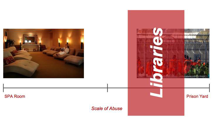 在惡意使用量表中,左邊是spa房間,安靜、平和(hé),右邊是監獄的(de)院子(zǐ),吵鬧、暴躁。圖書館的(de)家具和(hé)設備的(de)耐用程度和(hé)監獄的(de)配備要求非常接近。