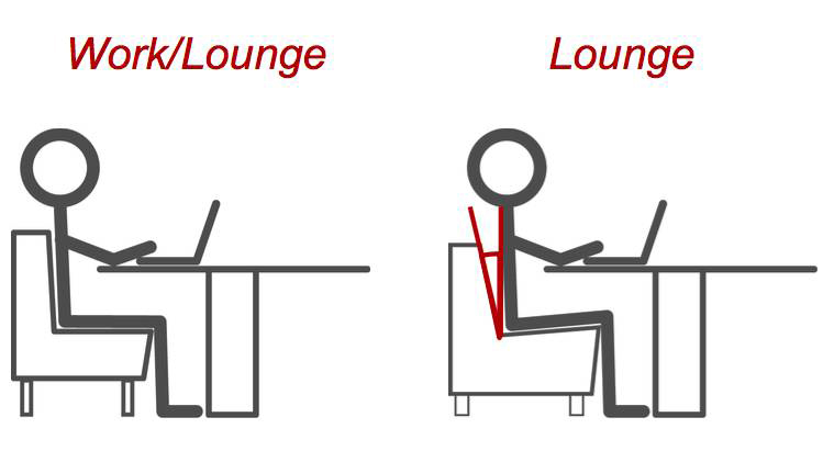 在休息和(hé)工作之間還有一(yī)種複合型,結合了休息型椅子(zǐ)中柔軟的(de)部分和(hé)符合人體工程學(xué)的(de)工作台。請看下圖,左邊的(de)椅子(zǐ)就是複合型的(de),讀者的(de)背部可(kě)以完全貼合椅背;右邊是休息室的(de)椅子(zǐ),讀者背部和(hé)椅子(zǐ)背部是不能貼合的(de),屁股隻能貼在椅子(zǐ)上,因為(wèi)座位有一(yī)定的(de)坡度和(hé)深度,椅子(zǐ)背部也是傾斜的(de)。