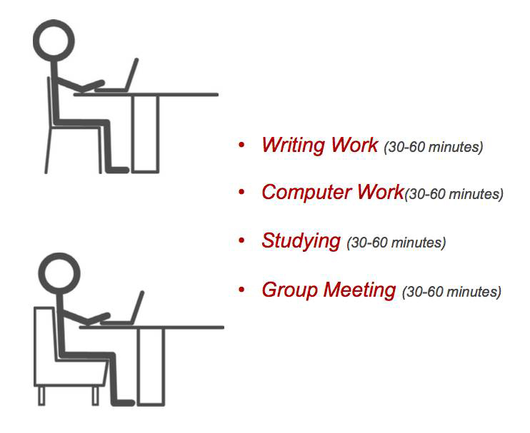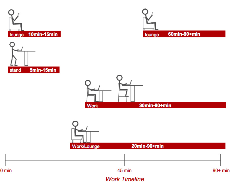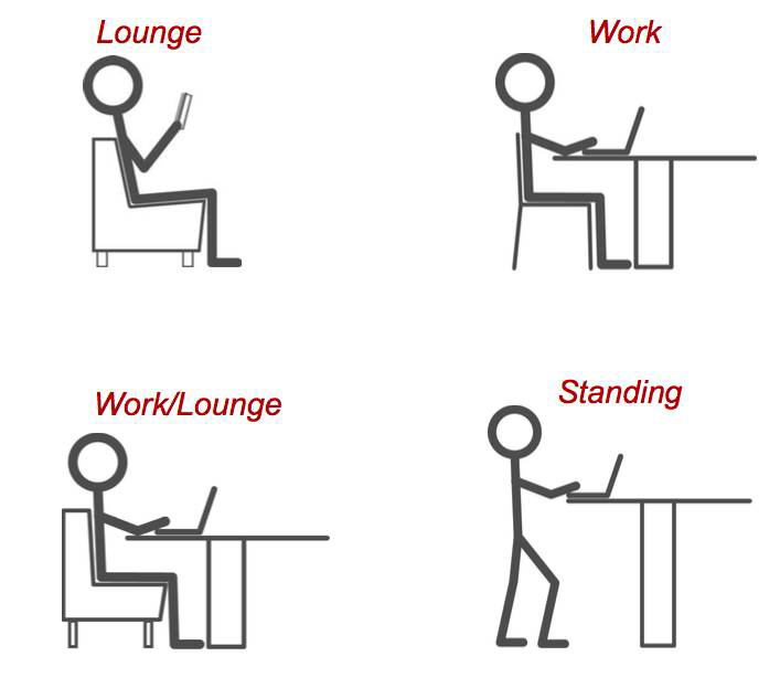 下圖是以上提到的(de)四種類型,你可(kě)以看到讀者在不同模式下花費的(de)時間。 這些模式,與單個家具的(de)舒适性沒有太大關系,更多地(dì)體現整個房間的(de)舒适度。你應該知道(dào)讀者在特定地(dì)點花費的(de)時間,具體在忙什麽類型的(de)工作。 例如(rú),如(rú)果你有一(yī)個區域,讀者的(de)行為(wèi)主要是低(dī)頭的(de)、較長(cháng)時間的(de)安靜工作,你需要的(de)是工作型和(hé)複合型的(de)配備桌椅。這種情況下,你在房間的(de)中間放置站立型的(de)桌子(zǐ)就會顯得不合時宜,因為(wèi)它可(kě)能影響較低(dī)桌子(zǐ)(工作型和(hé)複合型)上讀者的(de)工作狀态。