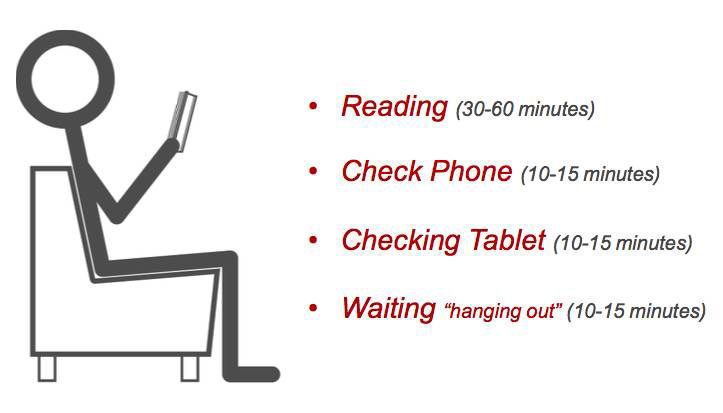 這裏通常是一(yī)些較短(duǎn)時間的(de)活動,大概10-15分鍾,比如(rú)查看手機、查看平闆電腦、等待約會等。但也有例外,通常一(yī)個人自(zì)己閱讀的(de)時候,時間可(kě)能會持續30-60分鍾。
