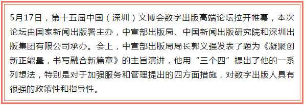 習近平總書記強調,互聯網正在媒體領域催發一(yī)場前所未有的(de)變革,全媒體不斷發展,出現了全程媒體、全息媒體、全員媒體、全效媒體,信息無處不在、無所不及、無人不用;強調建設全媒體成為(wèi)我們面臨的(de)一(yī)項緊迫課題,要運用信息革命成果,推動媒體融合向縱深發展,做(zuò)大做(zuò)強主流輿論;強調要堅持正能量是總要求、管得住是硬道(dào)理(lǐ)、用得好是真本事,打造新型傳播平台,建成新型主流媒體。本屆文博會集中展現了國家數字出版産業基地(dì)(園區)在推動出版與科技融合方面取得的(de)豐碩成果,展現了數字出版産業蓬勃興旺的(de)發展态勢。同時,要清醒地(dì)看到,當前我國出版融合發展正處在爬坡過坎的(de)關鍵期,傳統出版與新興出版從“相加”到真正完全“相融”還有不小距離(lí)。我們要深入學(xué)習貫徹總書記重要論述,充分認識出版融合發展是大勢所趨,充分認識在我國出版業由大變強、由并跑到領跑的(de)進程中數字出版承擔的(de)重要責任,因勢而謀、應勢而動、順勢而為(wèi),堅持導向為(wèi)魂、移動為(wèi)先、內(nèi)容為(wèi)王、創新為(wèi)要,切實增強做(zuò)好數字出版、融合發展工作的(de)責任感緊迫感和(hé)自(zì)覺性堅定性,做(zuò)到四個堅持。