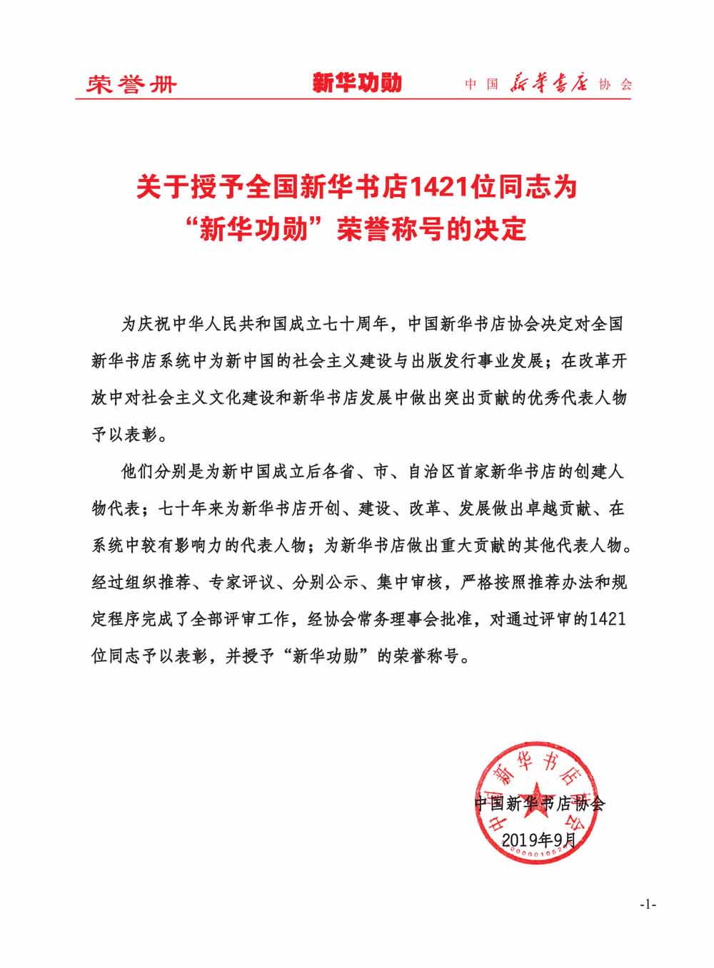 在喜迎新中國成立70周年(nián)之際,為(wèi)表彰新中國成立以來,全國新華書店為(wèi)社會主義文化建設和(hé)出版發行事業做(zuò)出重要貢獻的(de)員工,中國新華書店協會組織全國新華書店系統開展“新華功勳”推選,經過組織推薦、專家評議、分别公示、集中審核,全國新華書店系統共有1421位新華人獲評“新華功勳”。入選人員中有新中國成立後各省、市、自(zì)治區首家新華書店的(de)創建人代表,有七十年(nián)來為(wèi)社會主義先進文化傳播、為(wèi)新華書店改革創新、建設發展做(zuò)出卓越貢獻的(de)代表。近日,“輝煌70年(nián) 奮進新華人——‘新華功勳’授牌儀式”在河北省石家莊市舉行,來自(zì)全國各省市(區)近300名“新華功勳”代表參加授牌儀式并接受表彰。