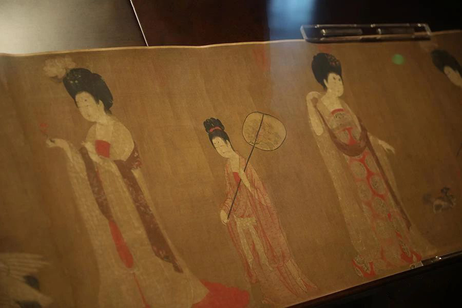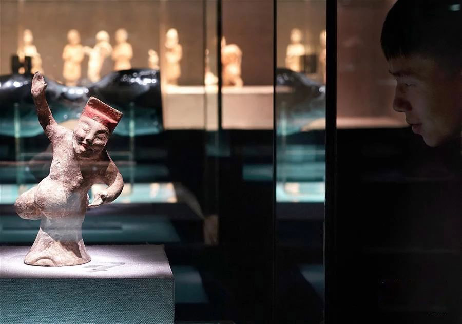 參觀者在“絲路天籁——漢唐宋元絲路樂(yuè)舞文物展”上觀看展品《彩繪舞俑》