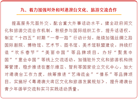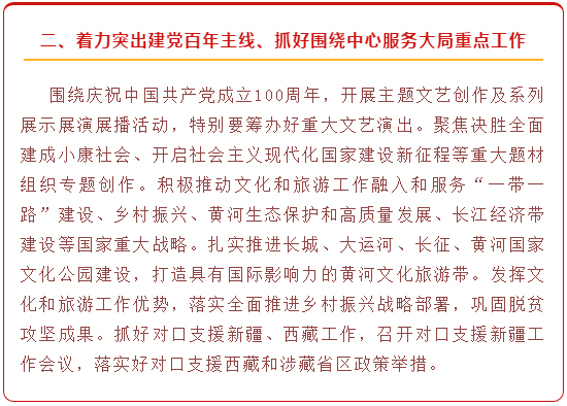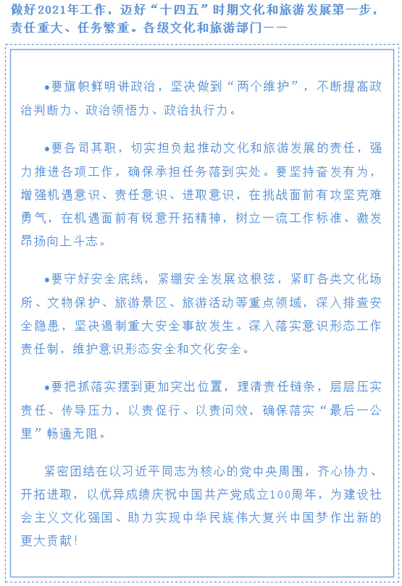 ( 本文內(nèi)容根據文化和(hé)旅遊部黨組書記、部長(cháng)胡和(hé)平在2021年(nián)全國文化和(hé)旅遊廳局長(cháng)會議上的(de)講話,以及相關會議材料整理(lǐ)制作。)