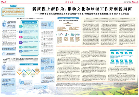 2021年(nián)1月18日《中國文化報》第2、3版刊發特别報道(dào)《新征程上新作為(wèi),推動文化和(hé)旅遊工作開創新局面》