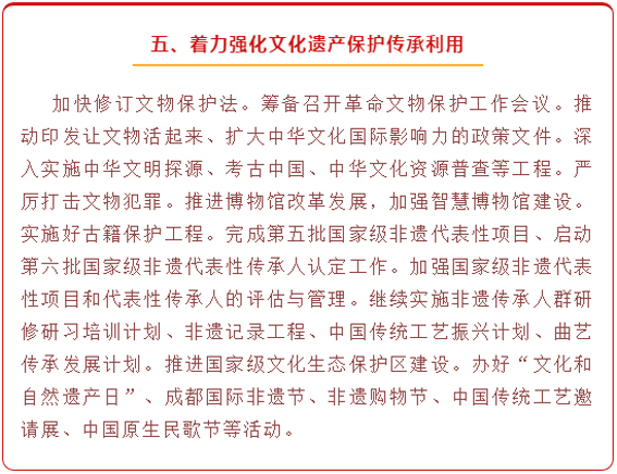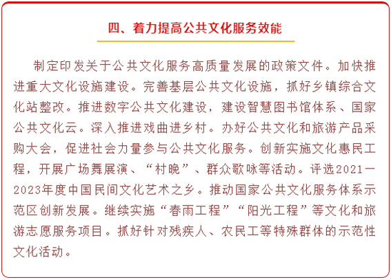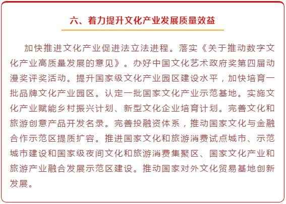 第二,要着力堅定文化自(zì)信,推進文化鑄魂、發揮文化賦能作用。 文化建設是培根鑄魂、凝神聚力的(de)事業,文化工作是以文化人、以文育人、以文培元的(de)工作,有助于啓迪思想、陶冶情操、溫潤心靈,有助于培育弘揚社會主義核心價值觀、建設中華民族精神家園,有助于滿足人民美好生活需要、不斷增強人民精神力量。要堅持把社會效益放在首位、社會效益和(hé)經濟效益相統一(yī),努力提供更多既能滿足人民文化需求,又能增強人民精神力量的(de)優秀文藝作品和(hé)優秀文化産品。充分發揮文化推動高(gāo)質量發展的(de)支點作用、戰勝前進道(dào)路上各種風險挑戰的(de)重要力量源泉作用,為(wèi)經濟社會高(gāo)質量發展賦能。一(yī)是要把培育弘揚社會主義核心價值觀作為(wèi)根本任務。二是要更好滿足人民日益增長(cháng)的(de)精神文化需求。三是要不斷豐富人民精神世界、增強人民精神力量。四是要保護好傳承好弘揚好中華優秀傳統文化。五是要傳承革命文化、發展社會主義先進文化。