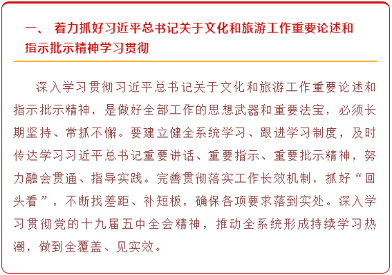 第一(yī),要深入學(xué)習貫徹習近平總書記關于文化和(hé)旅遊工作重要論述精神,增強工作責任感使命感。黨的(de)十八大以來,以習近平同志為(wèi)核心的(de)黨中央高(gāo)度重視(shì)文化和(hé)旅遊工作,習近平總書記發表一(yī)系列重要論述、作出一(yī)系列重要指示,為(wèi)做(zuò)好工作提供了根本遵循、指明了前進方向。必須反複學(xué)、深入學(xué),全面系統學(xué)、聯系實際學(xué),把握核心要義、明确工作要求、堅決貫徹落實。