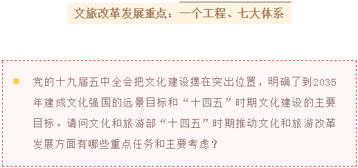 胡和(hé)平:“十四五”時期,文化和(hé)旅遊部将緊緊圍繞舉旗幟、聚民心、育新人、興文化、展形象的(de)使命任務,立足新發展階段、貫徹新發展理(lǐ)念,堅持擴大內(nèi)需這個戰略基點,以推動高(gāo)質量發展為(wèi)主題,以改革創新為(wèi)動力,以社會主義核心價值觀為(wèi)引領,以滿足人民文化需求和(hé)增強人民精神力量為(wèi)着力點,推進文化鑄魂、發揮文化賦能作用,推進旅遊為(wèi)民、發揮旅遊帶動作用,推進文旅融合、努力實現創新發展,努力創作優秀文藝作品、提供優秀文化産品和(hé)優質旅遊産品,服務構建新發展格局,開創文化和(hé)旅遊工作新局面,向着建設社會主義文化強國宏偉目标穩步前進。重點是實施一(yī)個工程、建設七大體系。