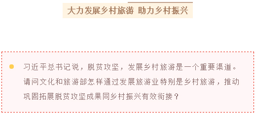 胡和(hé)平:正如(rú)習近平總書記指出的(de),脫貧攻堅,發展鄉村旅遊是一(yī)個重要渠道(dào)。近年(nián)來,各級文化和(hé)旅遊部門以習近平總書記扶貧開發重要戰略思想為(wèi)指引,把旅遊扶貧作為(wèi)一(yī)項重要政治任務和(hé)重點工作抓實抓細,取得了顯著成就,旅遊業特别是鄉村旅遊在全面打赢脫貧攻堅戰中的(de)積極作用得到有力發揮。