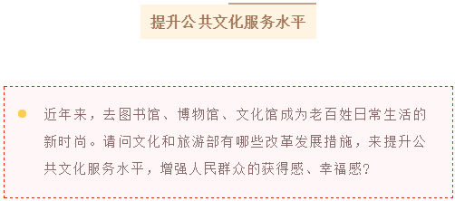 胡和(hé)平:黨的(de)十八大以來,中央在公共文化領域陸續啓動制定國家基本公共文化服務指導标準和(hé)地(dì)方實施标準、基層綜合性文化服務中心建設、縣級文化館圖書館總分館制建設等一(yī)系列重點改革;全國人大頒布實施了公共文化服務保障法、公共圖書館法兩部重要法律;文化和(hé)旅遊部會同相關部門統籌推進制度創新,出台一(yī)系列重要政策文件,各地(dì)也制定了配套政策和(hé)實施細則,實事求是确定任務目标,以釘釘子(zǐ)精神推進改革發展舉措落實落地(dì)。