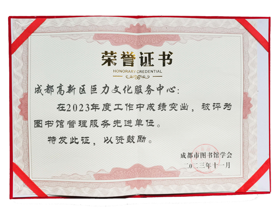 近日,我司榮獲了由成都市圖書館學(xué)會頒發的(de)“圖書館管理(lǐ)服務先進單位”榮譽證書,這是對我們在圖書館管理(lǐ)服務領域中所做(zuò)出的(de)卓越表現的(de)認可(kě)與肯定。